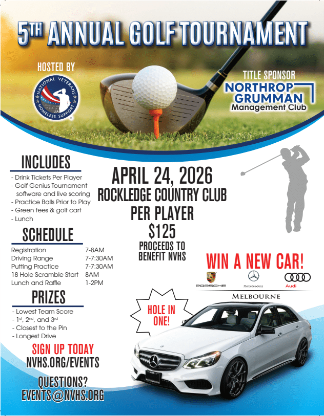 Please join us and the Northrop Grumman Melbourne Management Club for our 5th Annual Golf Tournament for Brevard Homeless and At-Risk Veterans! All proceeds will go directly to our mission to “Eliminate homelessness amount veterans in Central Florida.”